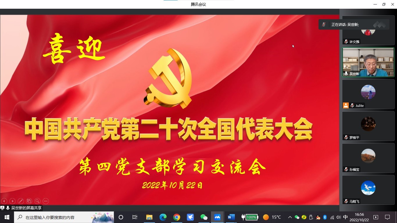 10月22日在黨的“二十大”勝利閉幕之際,支部通過視頻會(huì)形式組織全體黨員開展了“喜迎二十大,牢記使命、守正創(chuàng)新、踔厲奮發(fā)”主題黨日活動(dòng)。研究所副所長孫福寶以普通黨員身份參加活動(dòng)。全體黨員認(rèn)真學(xué)習(xí)了習(xí)近平總書記在黨的“二十大”開幕會(huì)上所作的報(bào)告,重溫了報(bào)告中的習(xí)語金句、關(guān)鍵詞,結(jié)合崗位工作實(shí)際和這十年來生活變化交流心得體會(huì)。