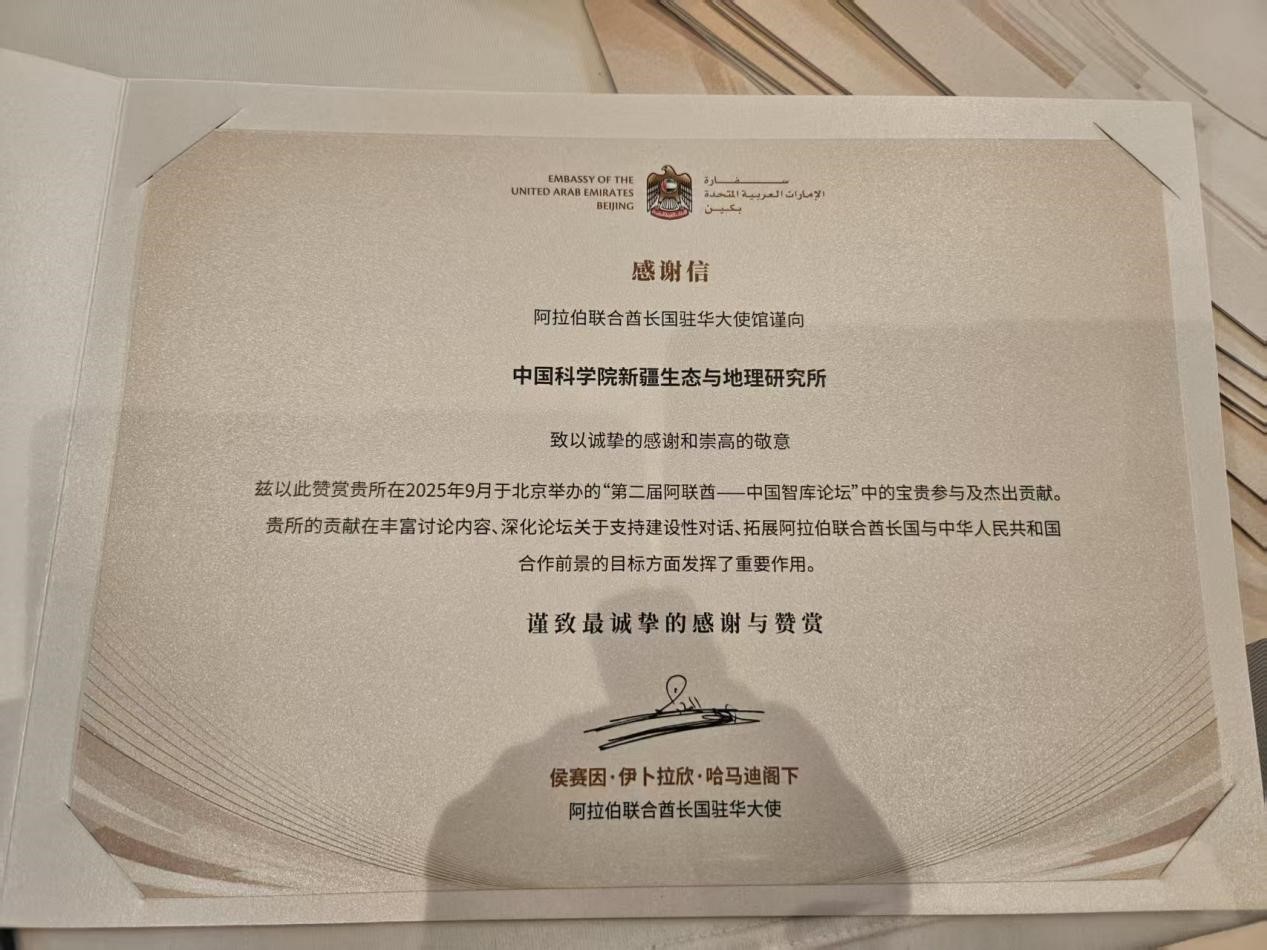 ????9月23日,由阿聯(lián)酋駐華大使館主辦的第二屆阿聯(lián)酋—中國智庫論壇在北京開幕。阿中雙方多位專家出席,并就各類議題發(fā)表演講。中國科學(xué)院新疆生態(tài)與地理研究所雷加強(qiáng)研究員及團(tuán)隊(duì)?wèi)?yīng)邀參會(huì),并與阿中雙方高級(jí)別代表及專家學(xué)者進(jìn)行深入交流。