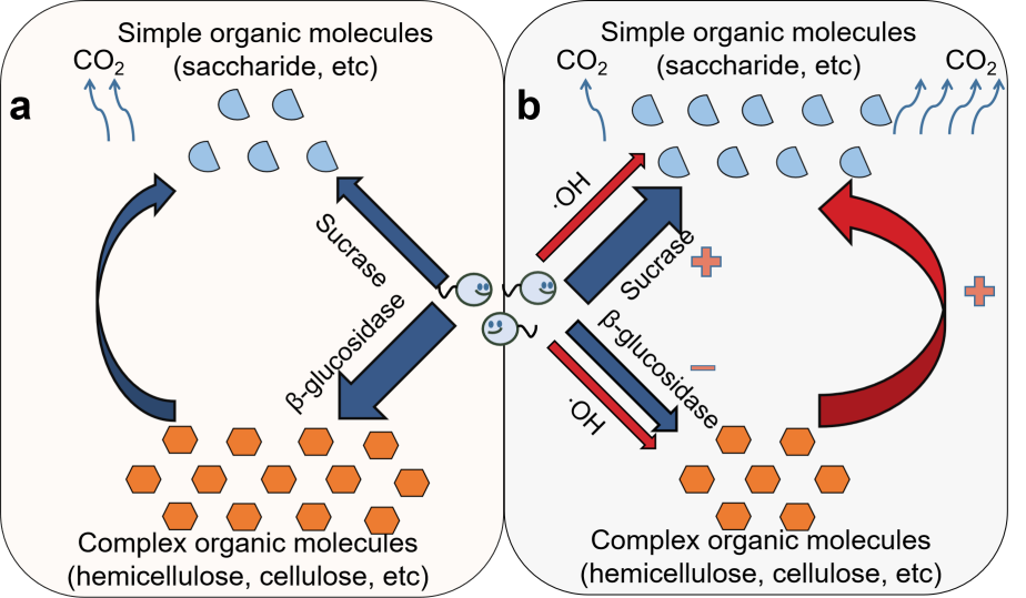 ????研究結(jié)果發(fā)現(xiàn),土壤復(fù)濕后,快速激活的微生物是·OH產(chǎn)生的主要途徑。當(dāng)淬滅·OH后,同位素標(biāo)記結(jié)果顯示CO2和N2O 24小時(shí)累積釋放量相對(duì)于對(duì)照組分別下降了11-21%和67-90%,證明·OH氧化作用在CO2和N2O釋放中的顯著作用。利用酶活性和有機(jī)質(zhì)組分結(jié)構(gòu)變化進(jìn)一步分析發(fā)現(xiàn),當(dāng)淬滅·OH后,有機(jī)質(zhì)組分結(jié)構(gòu)趨于簡(jiǎn)單,而負(fù)責(zé)分解小分子的酶活性顯著升高,這表明·OH氧化對(duì)復(fù)雜有機(jī)質(zhì)的分解使微生物能將更多能量用于分解小分子有機(jī)物。·OH氧化通過與微生物酶促反應(yīng)的協(xié)同作用促進(jìn)了CO2釋放。此外,通過淬滅·OH實(shí)驗(yàn)發(fā)現(xiàn),·OH是通過促進(jìn)NH4+轉(zhuǎn)化為NO3-,從而調(diào)控N2O的釋放。