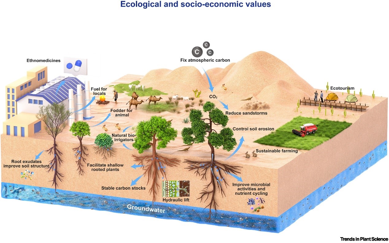 圖3:干旱生態(tài)系統(tǒng)中深根植物的生態(tài)與社會經(jīng)濟功能?