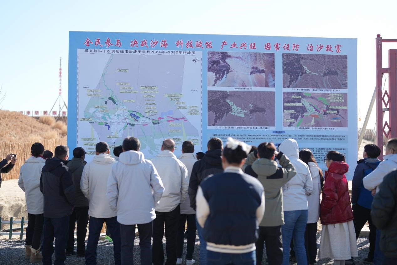 與會專家參觀“塔克拉瑪干沙漠鎖邊工程”和田段